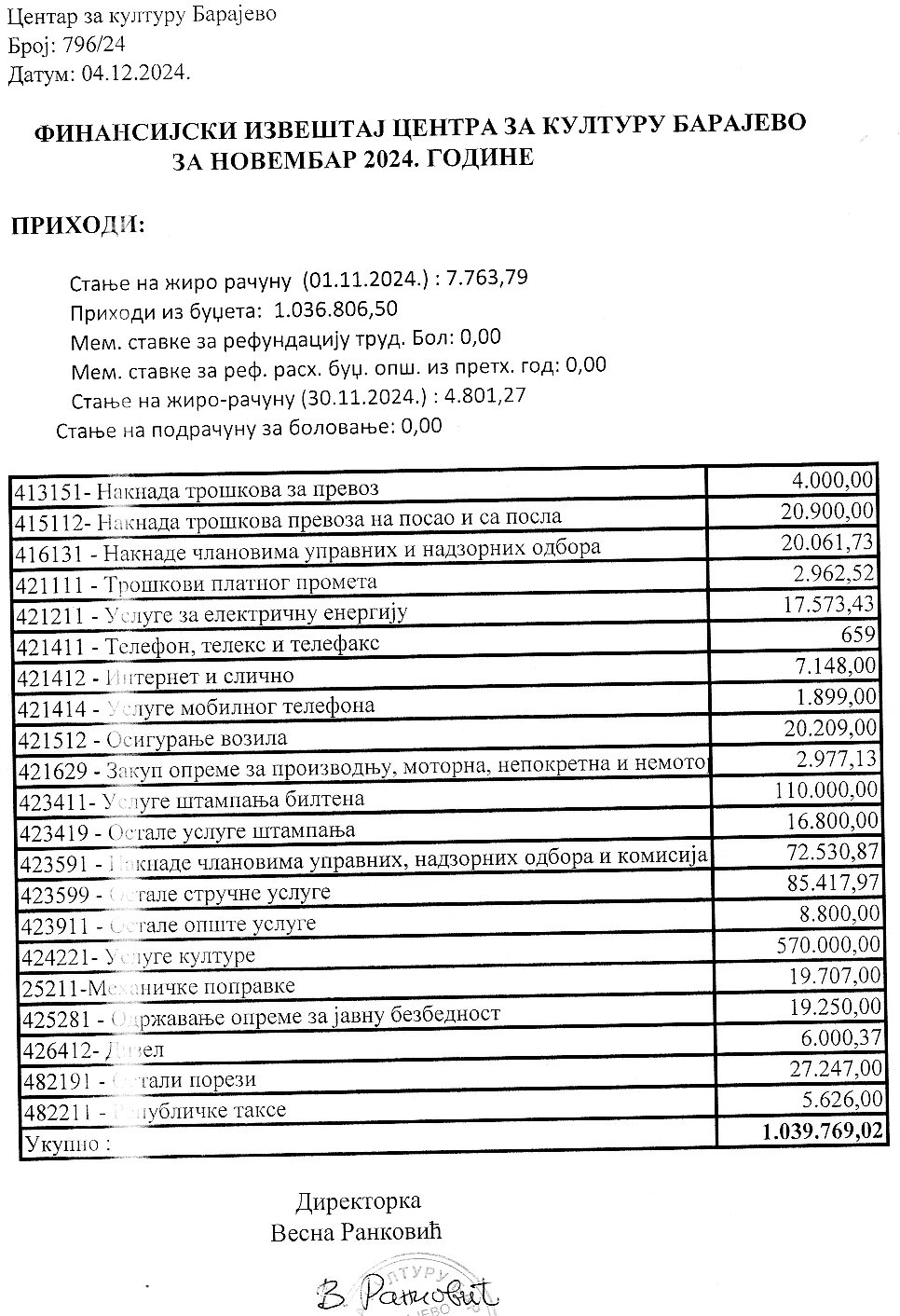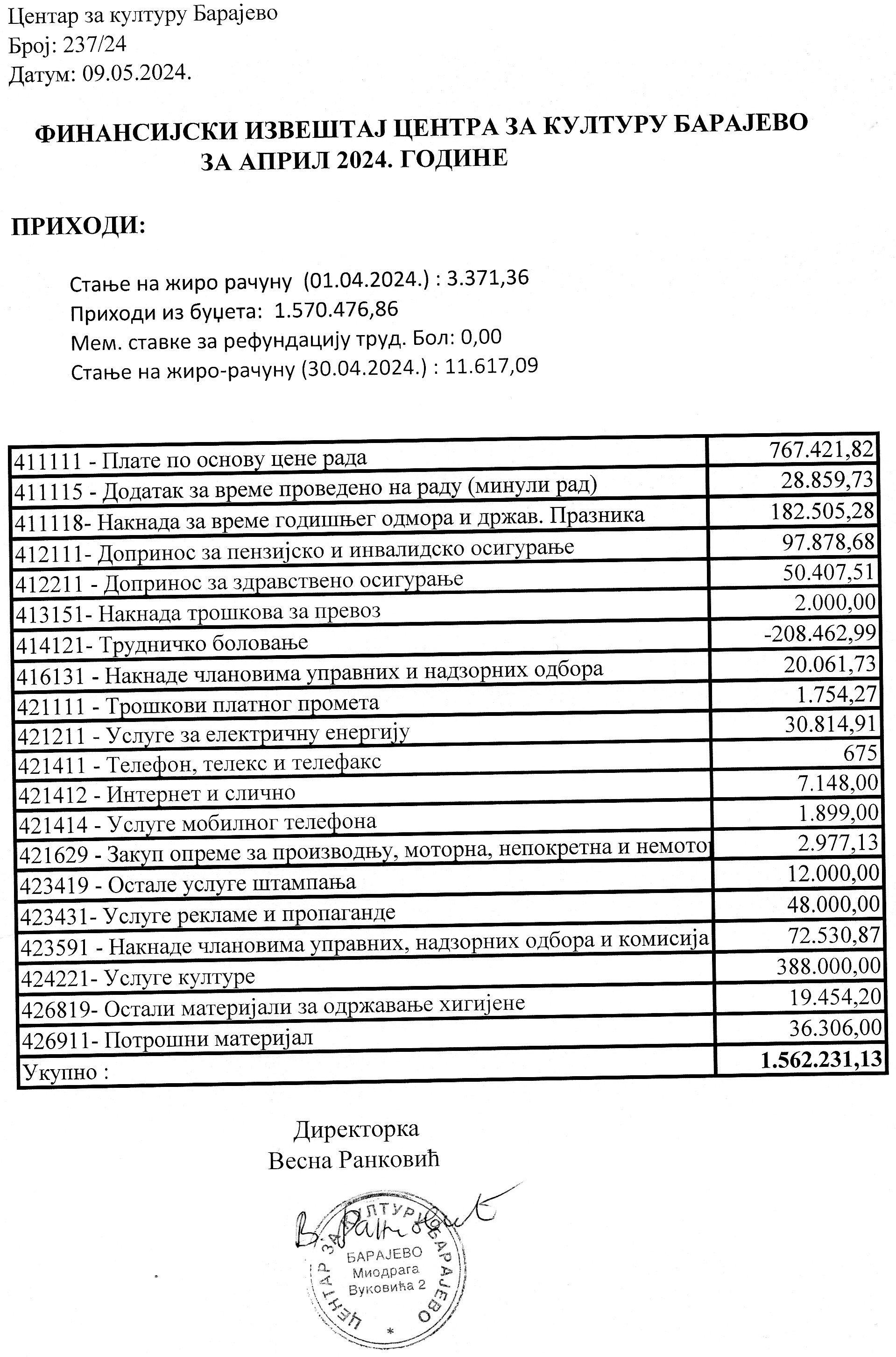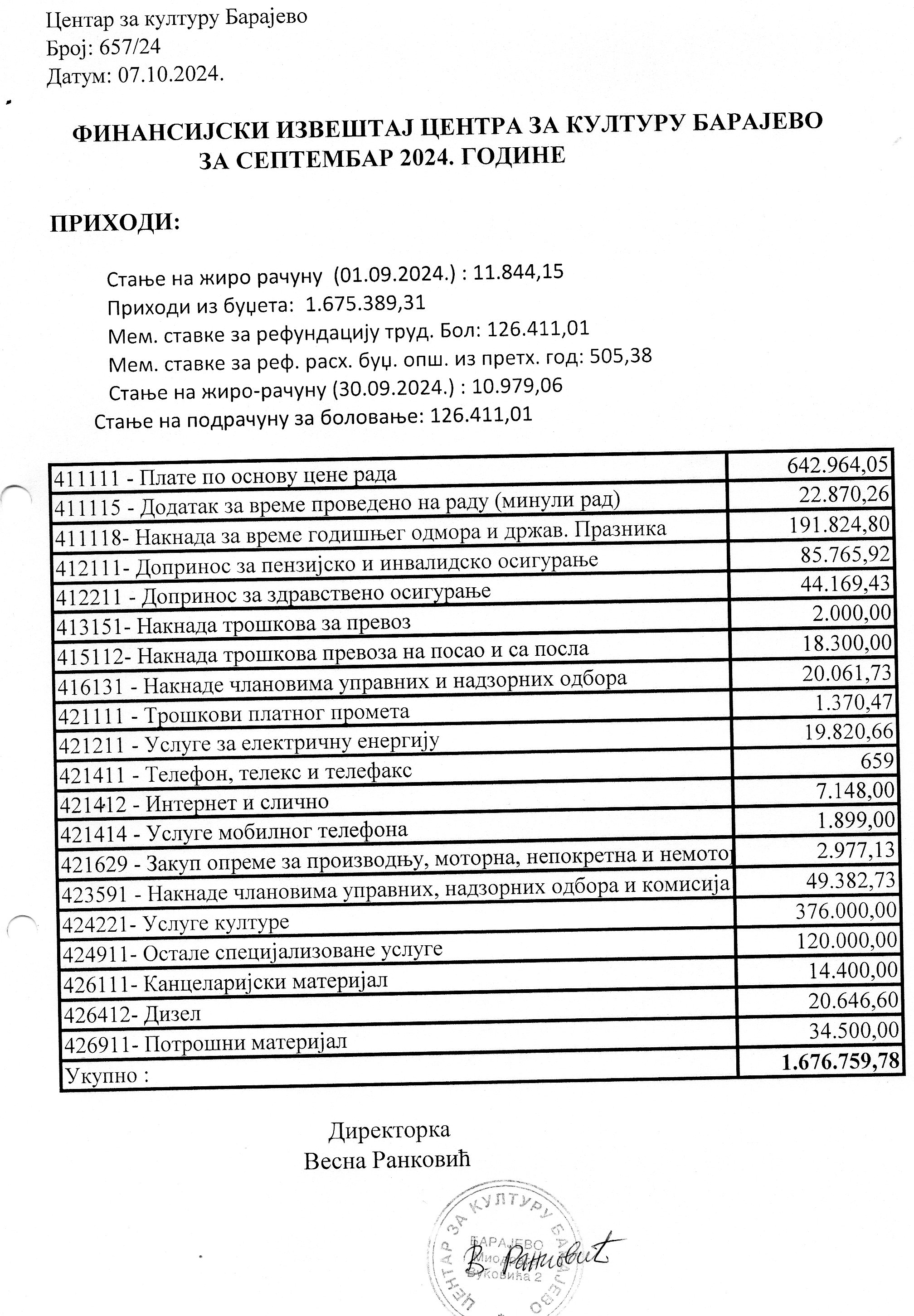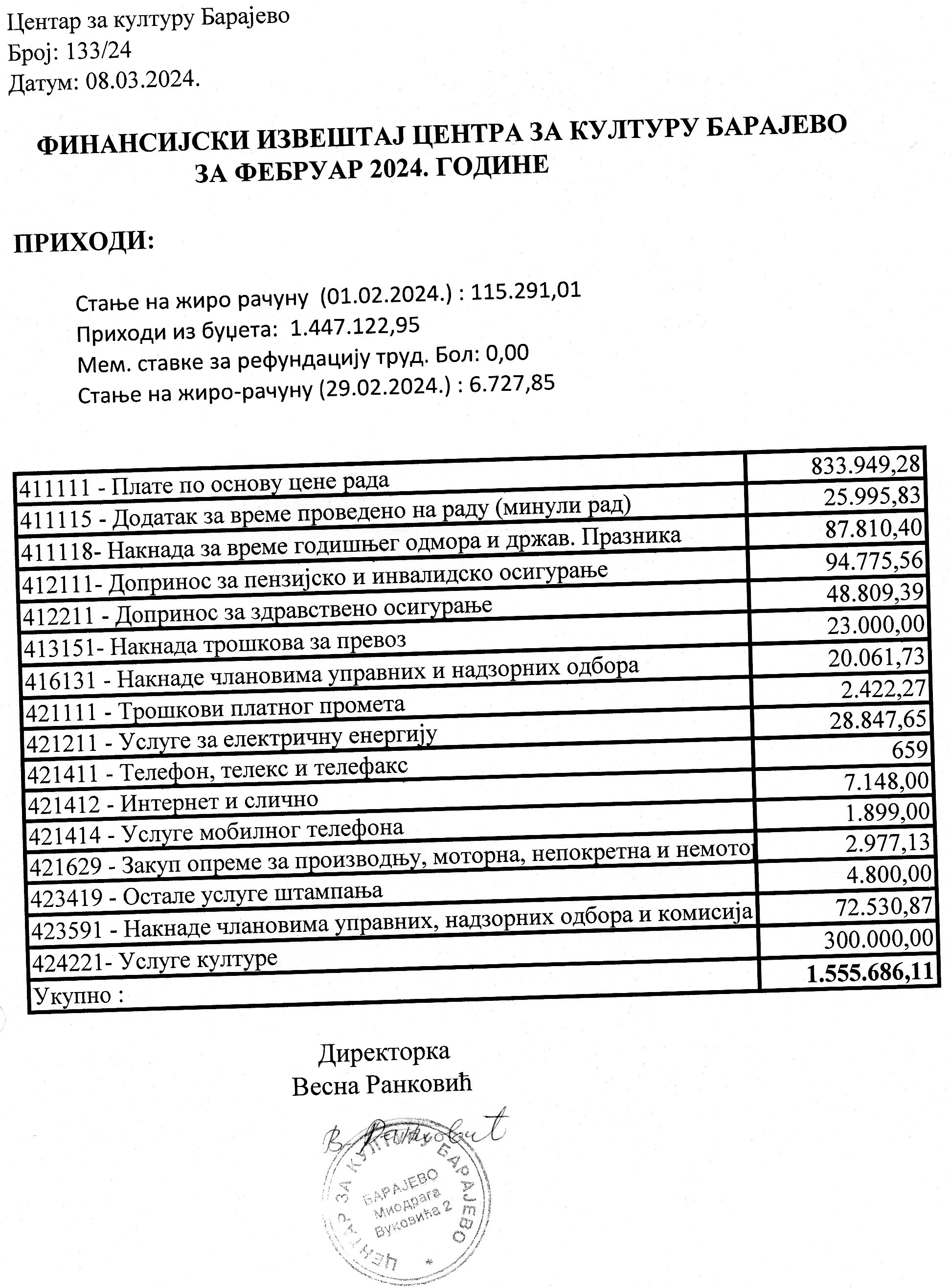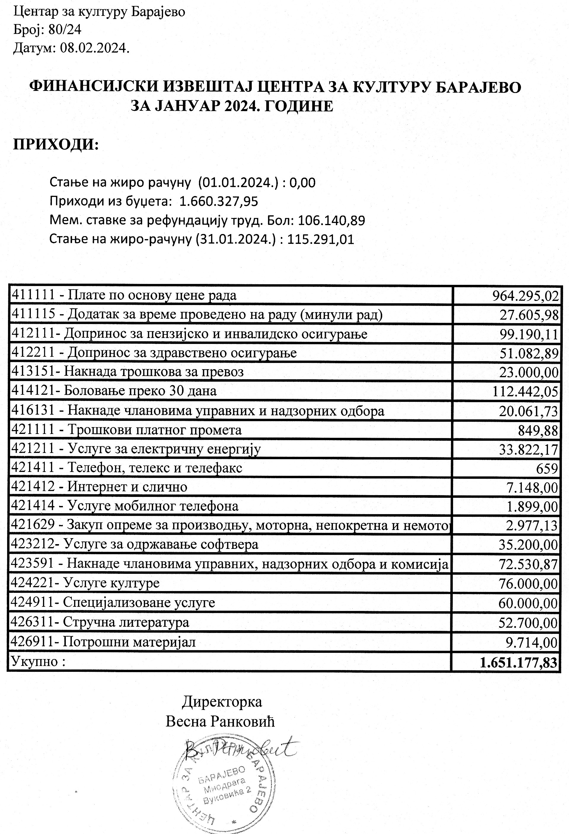 Финансијски план Центра за културу Барајево за период јануар – децембар 2024. године