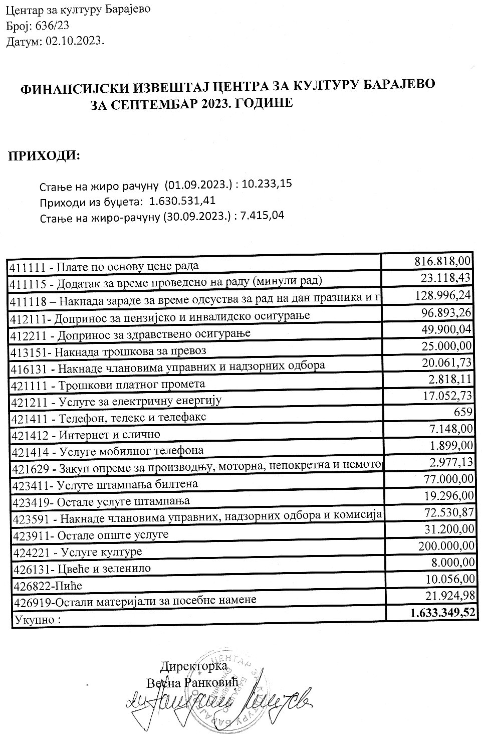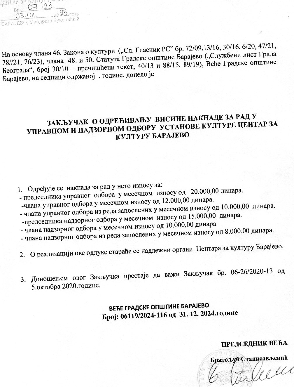 Решење Управни одбор Центра за културу Барајево