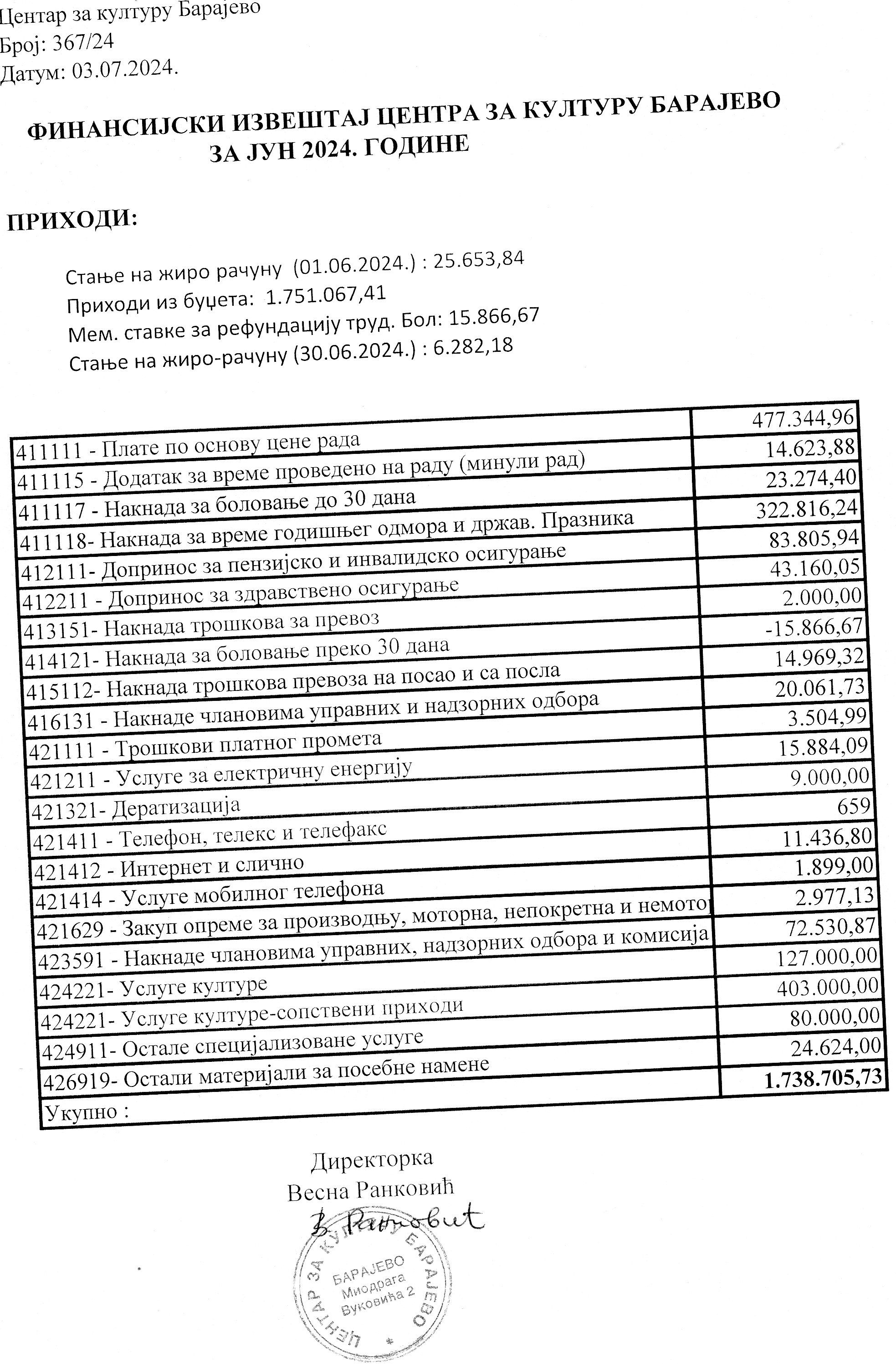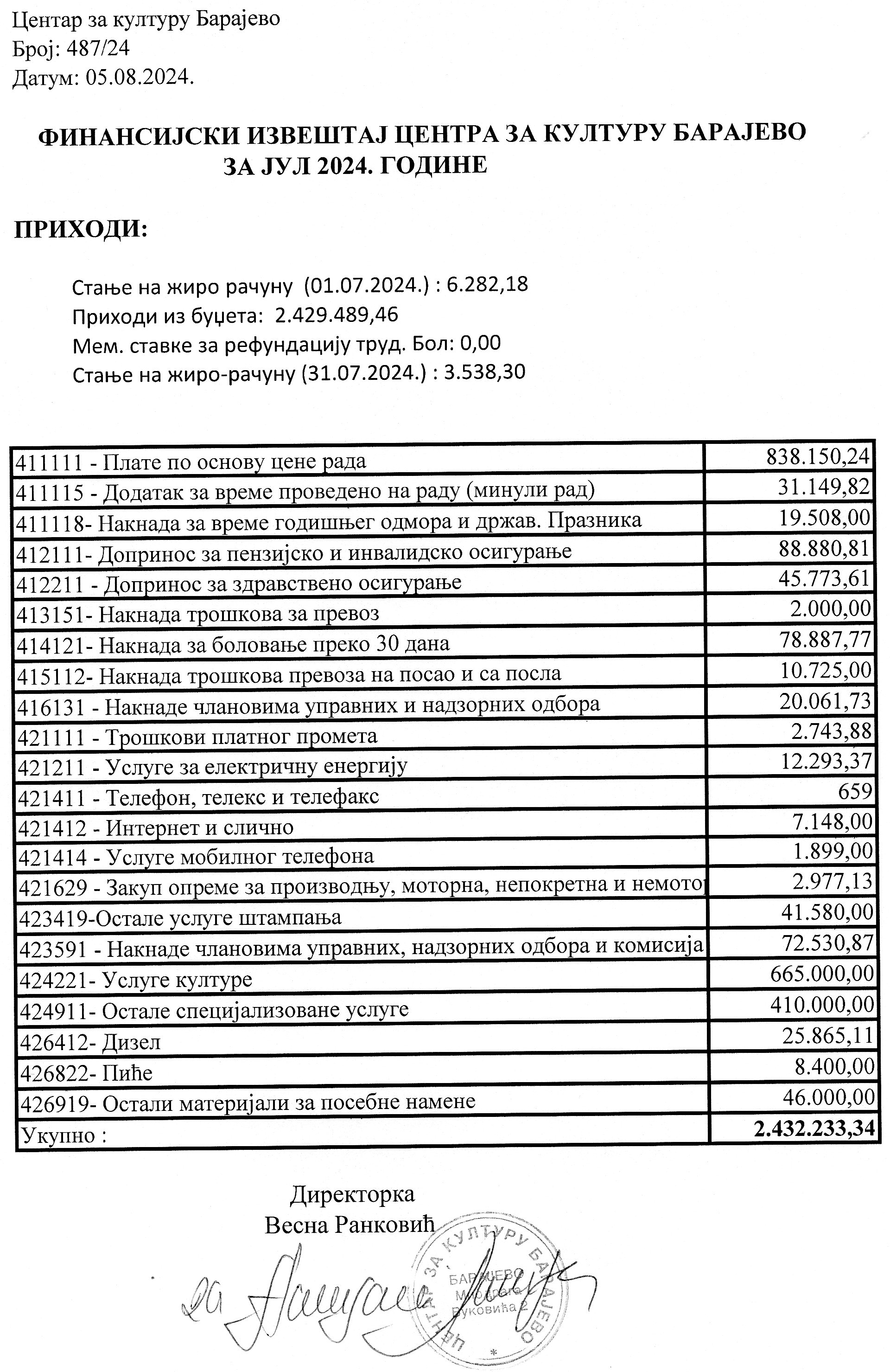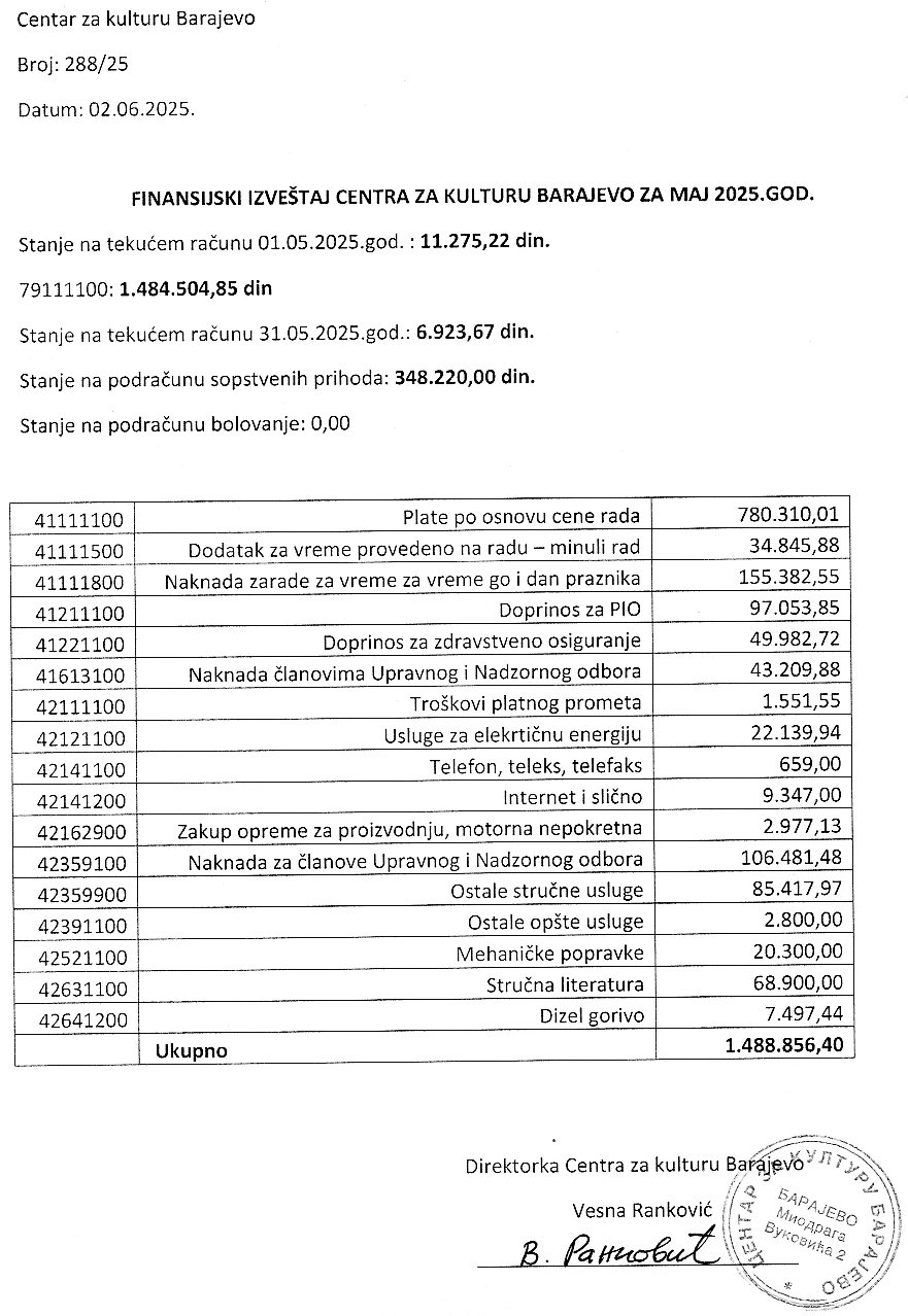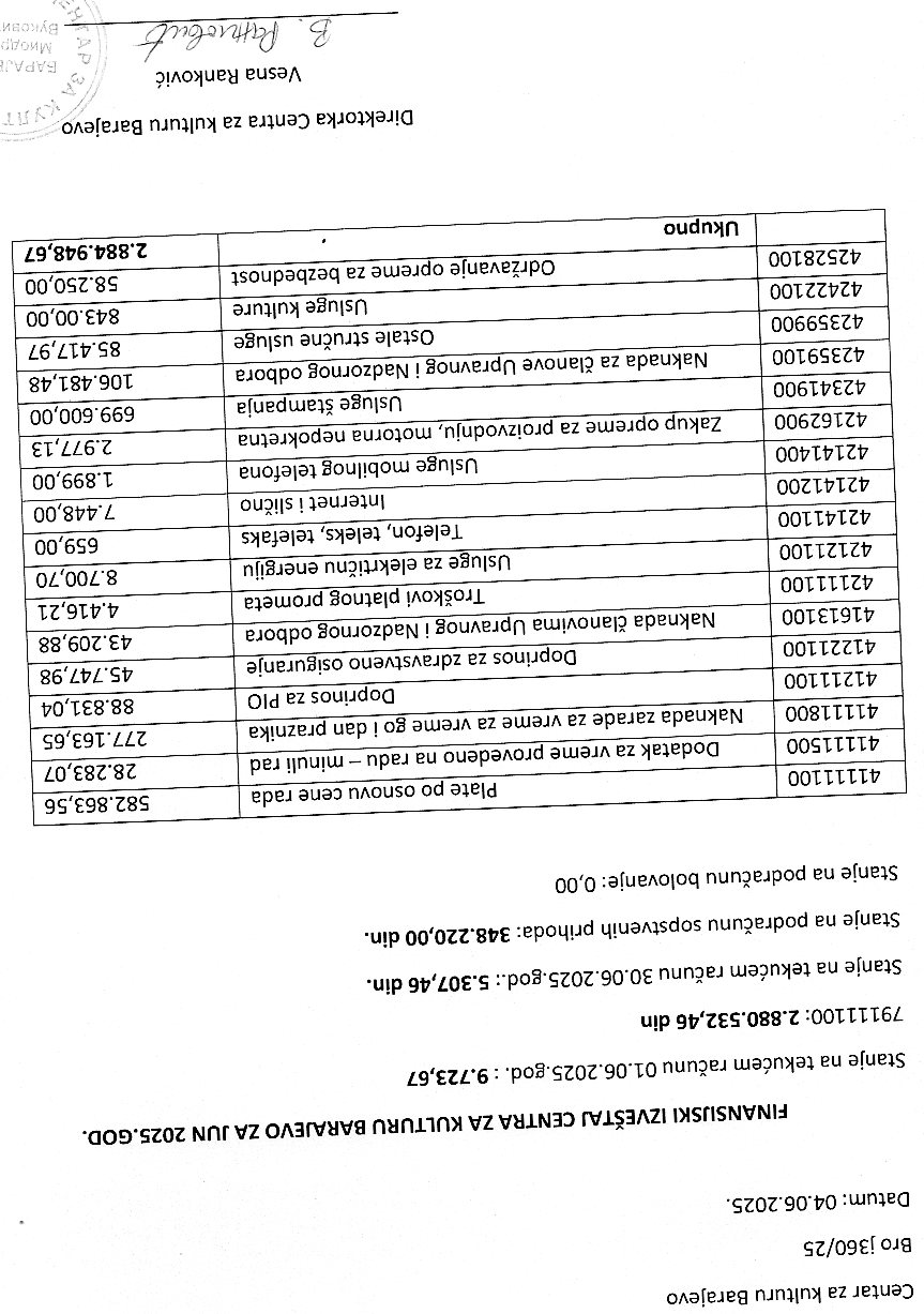 Одлука и Извештај о раду Центра за културу Барајево за период 01.01 – 31.06.2024. године