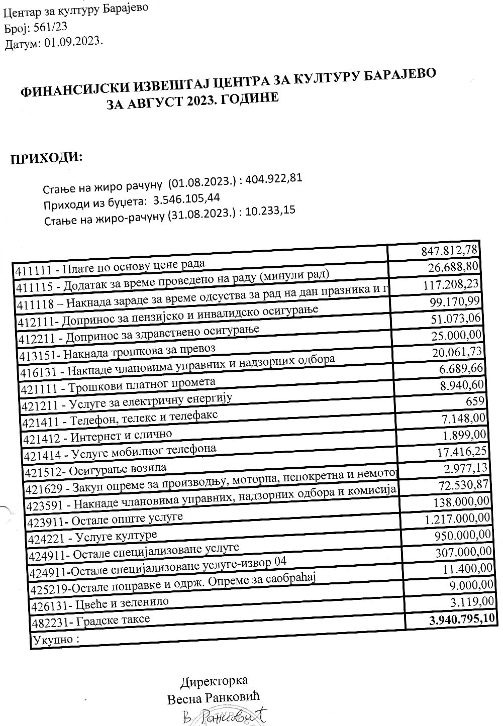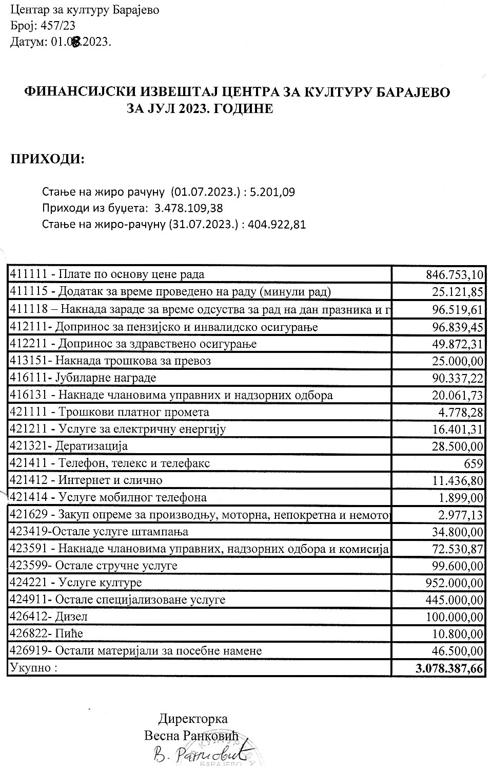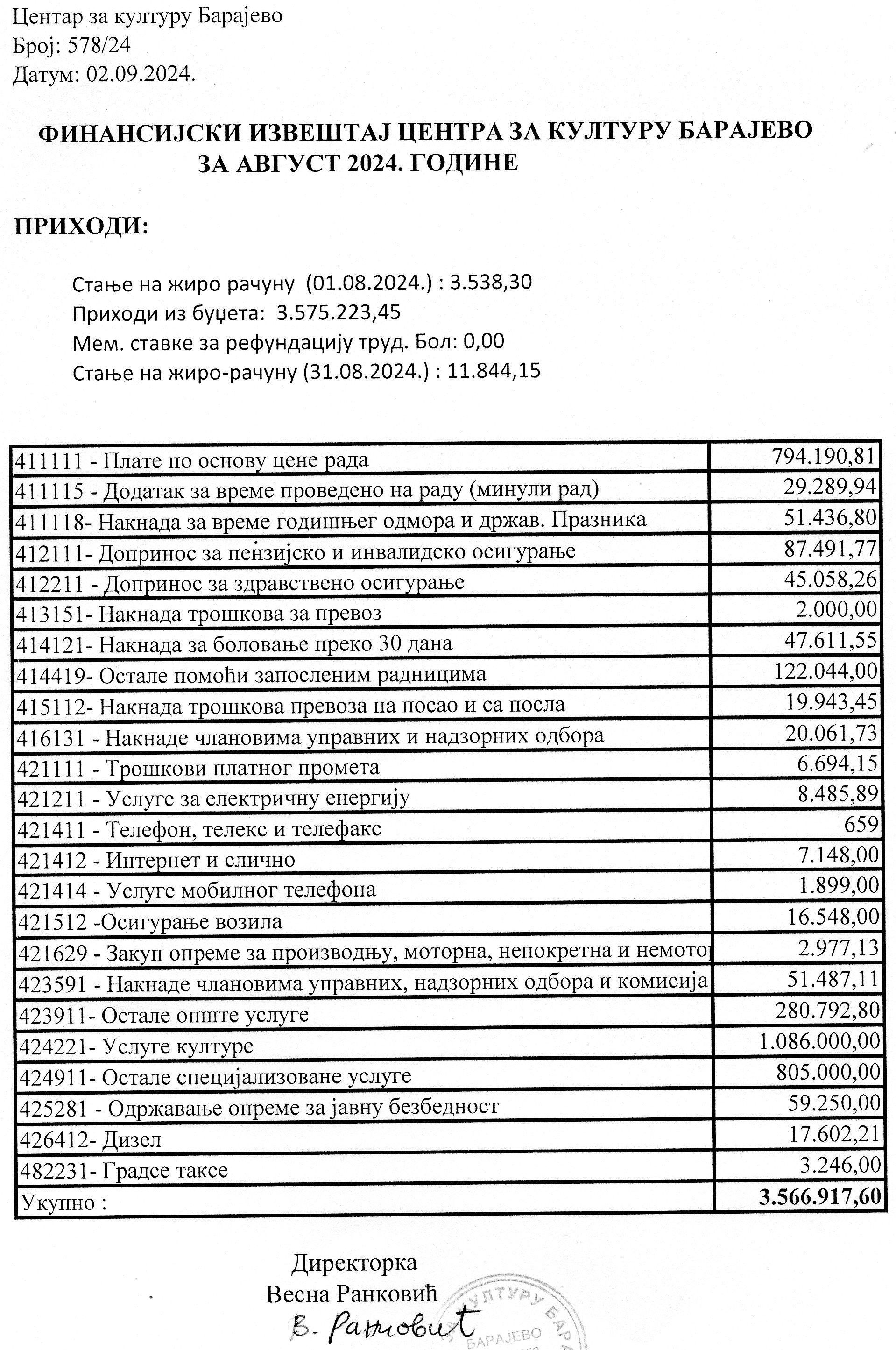Одлука и Извештај о раду Центра за културу Барајево за период 01.01 – 31.06.2024. године