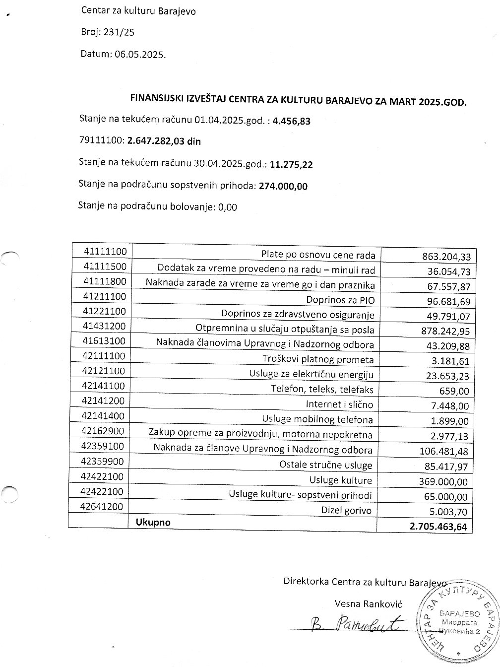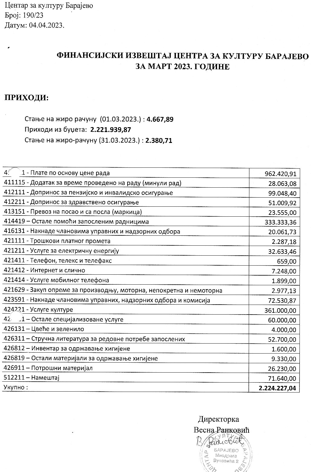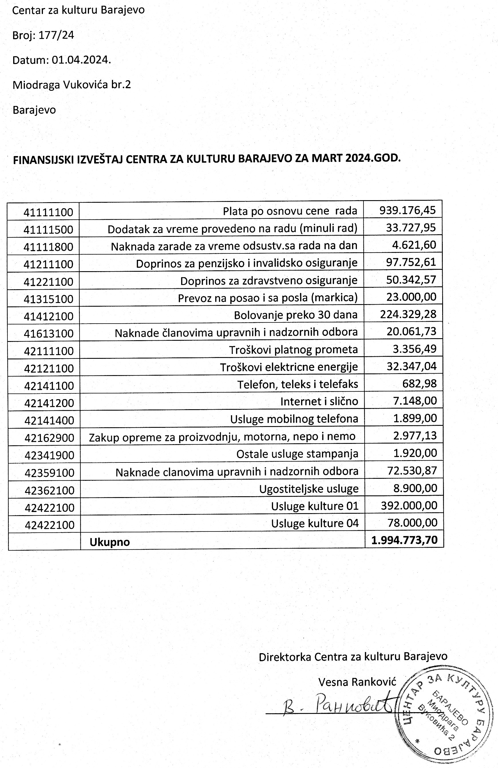 4. Финансијски извештај за први квартал јан-март