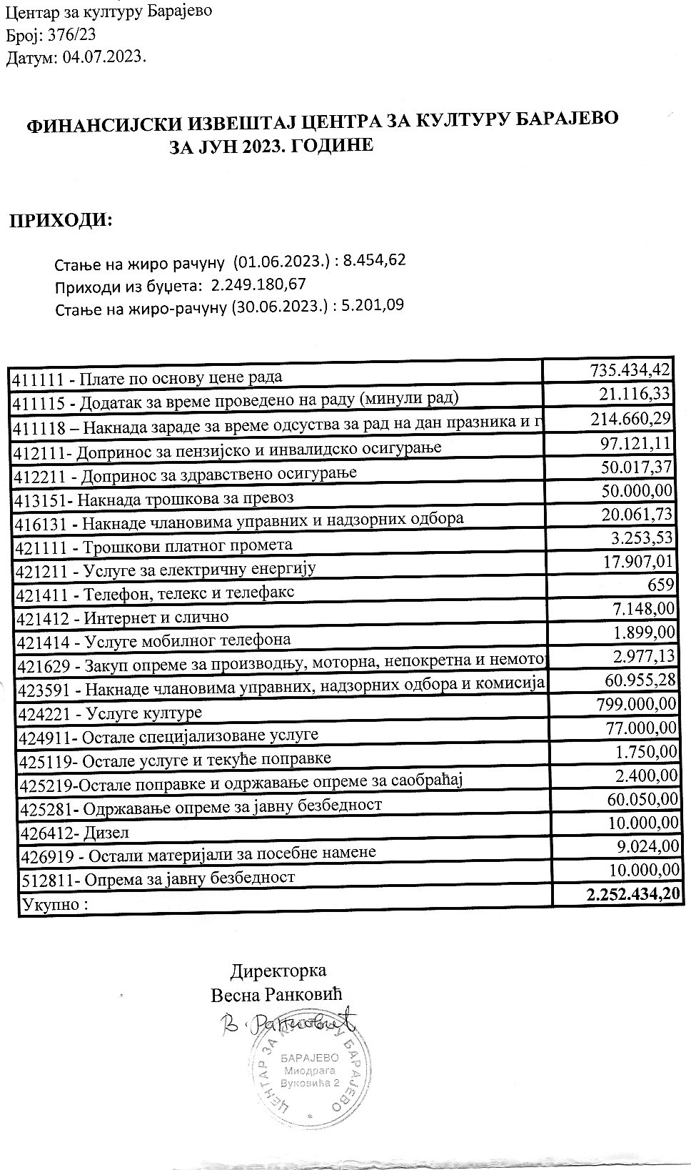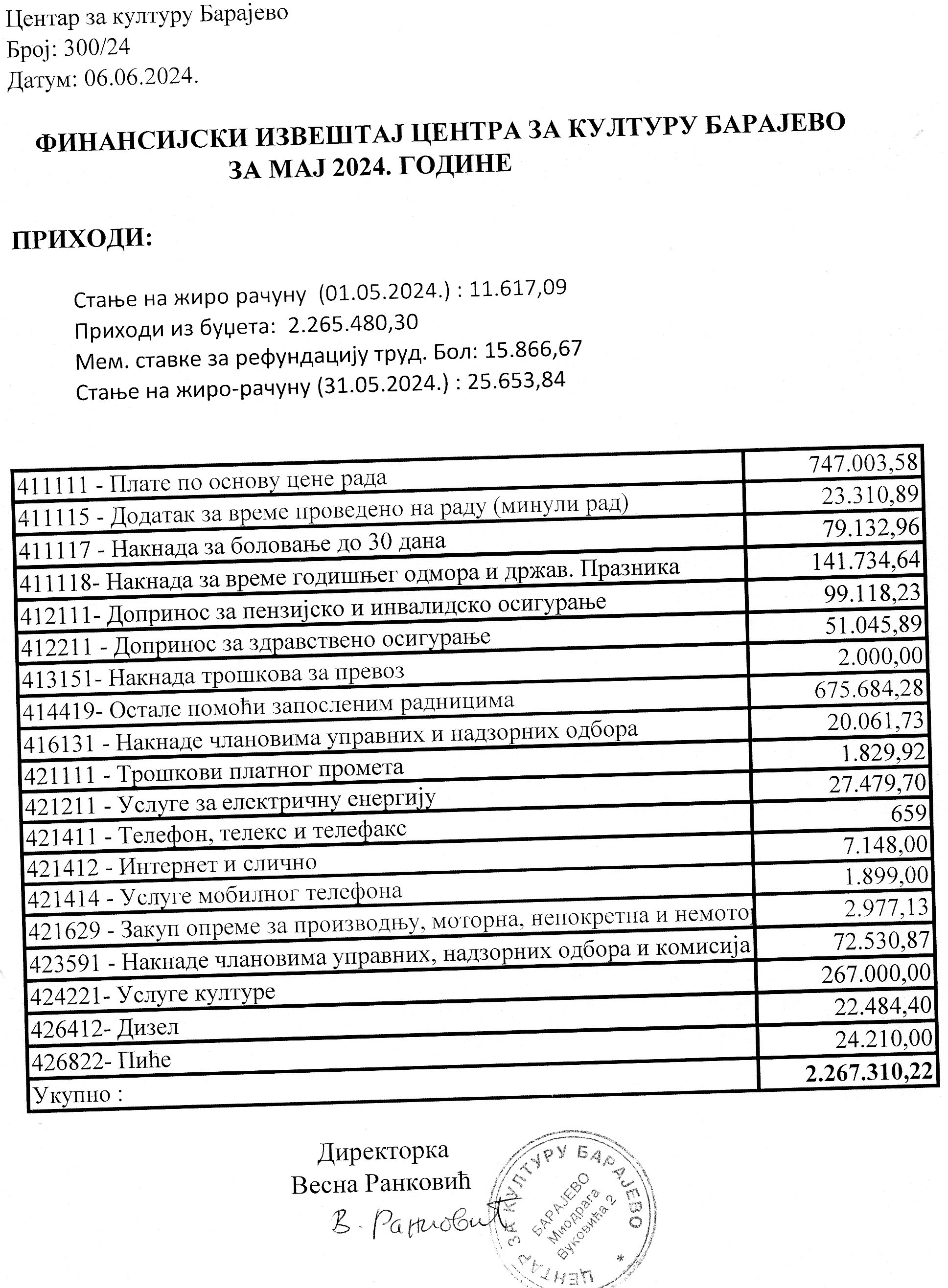Финансијски план Центра за културу Барајево за период од 01.01.2024-30.06.2024. године