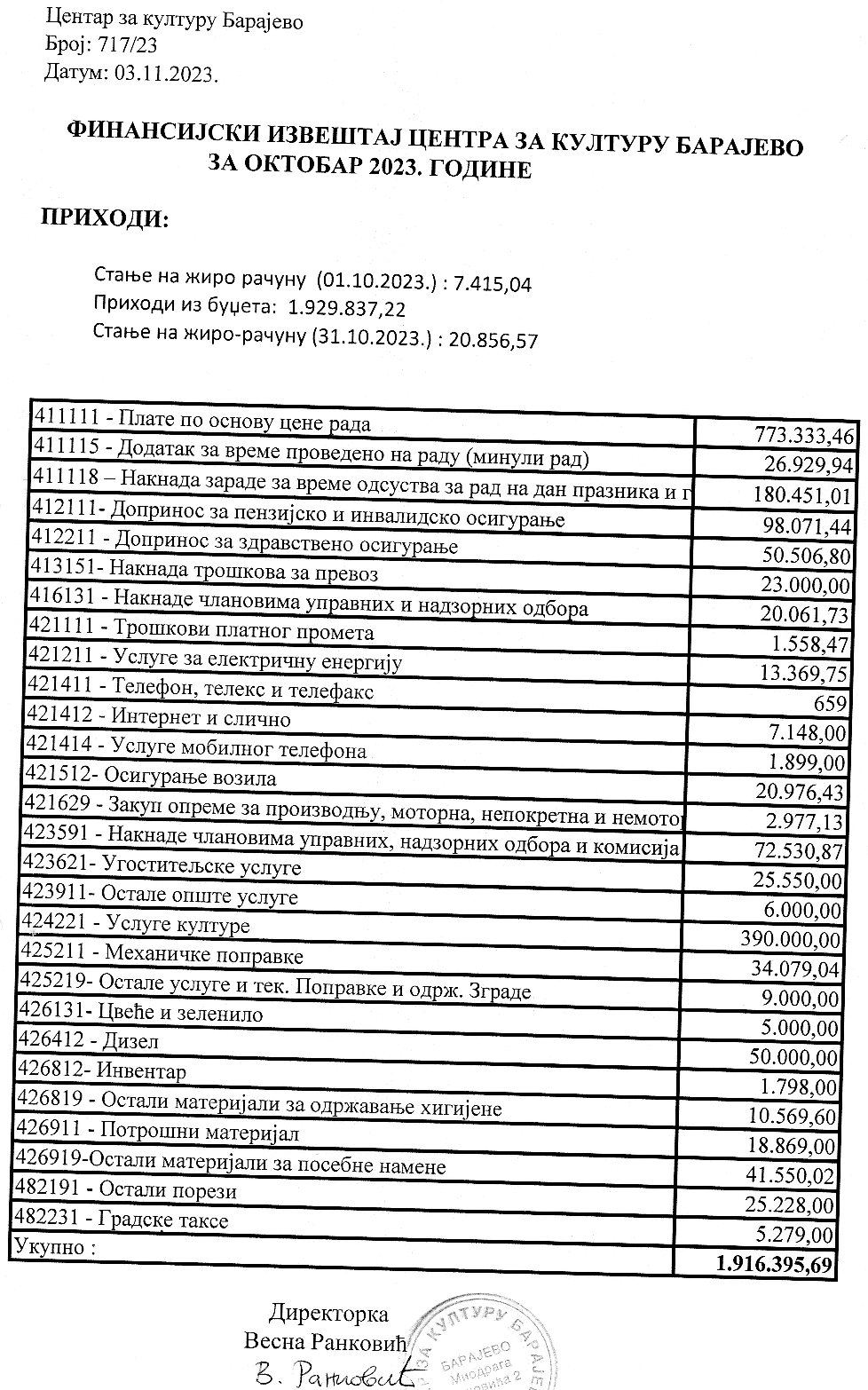 Финансијски извештај Центра за културу Барајево за новембар 2020. године