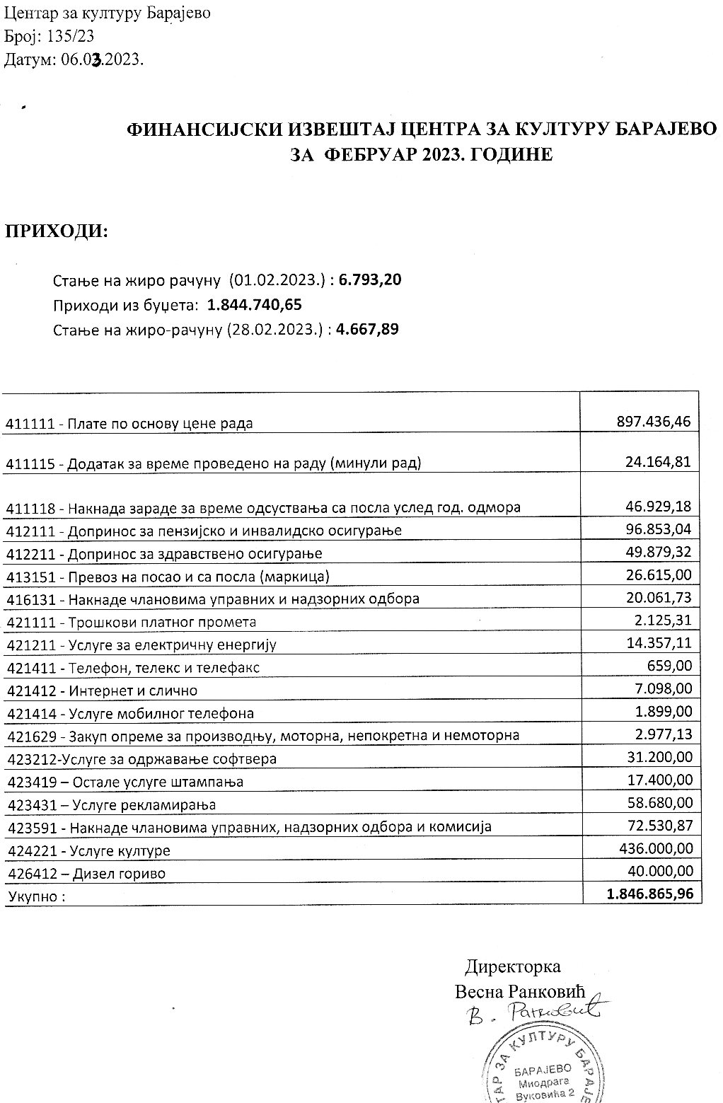 Шестомесечни извештај Центра за културу Барајево
