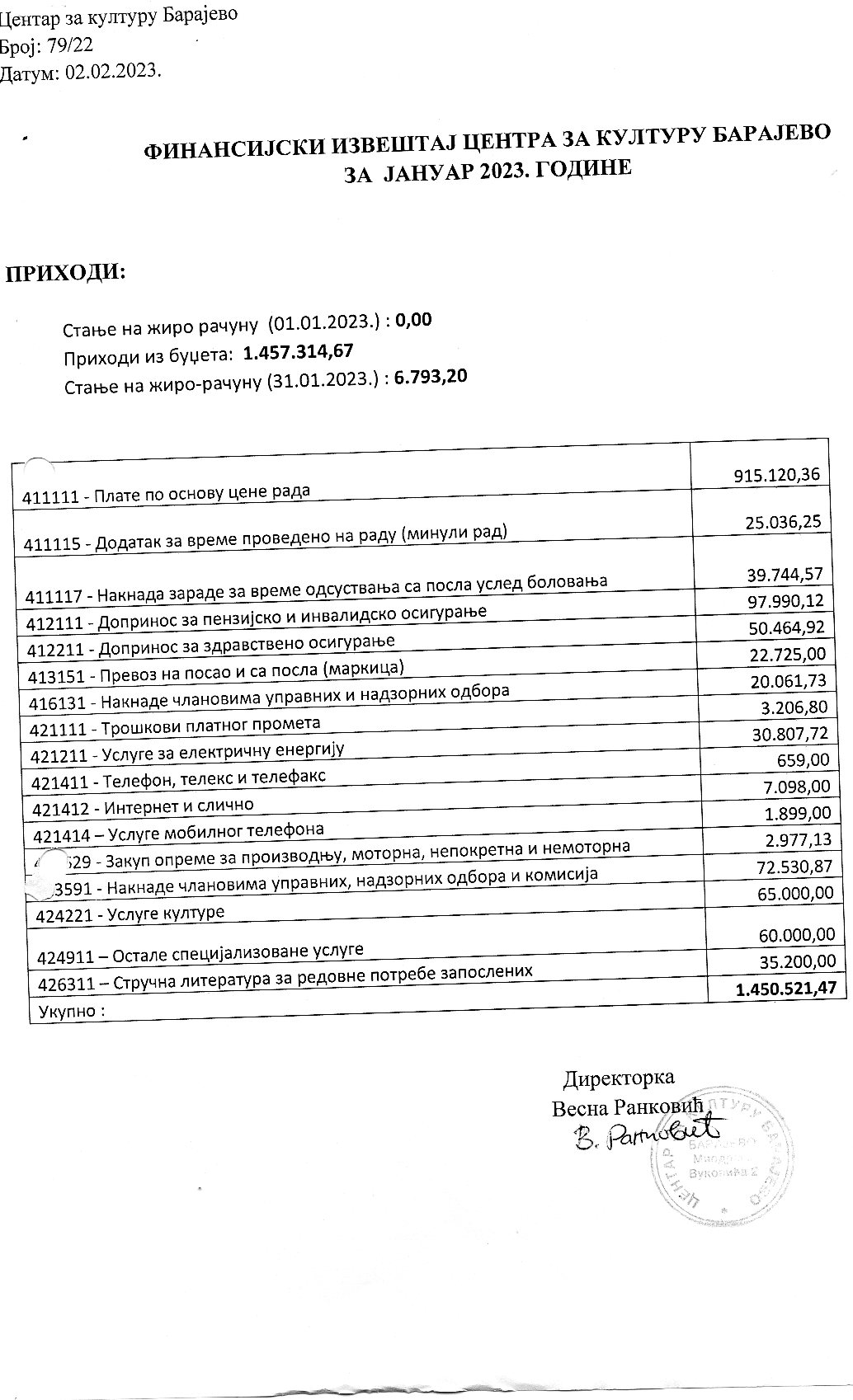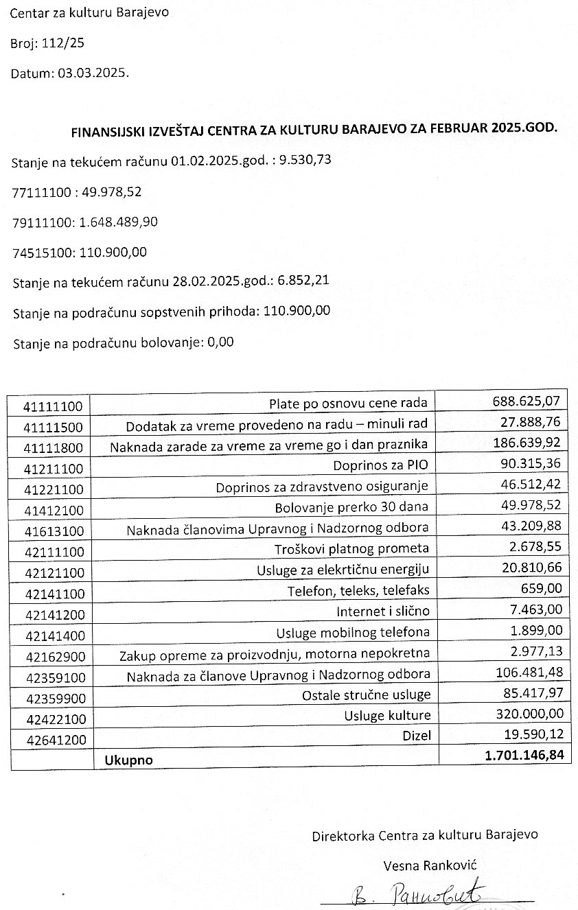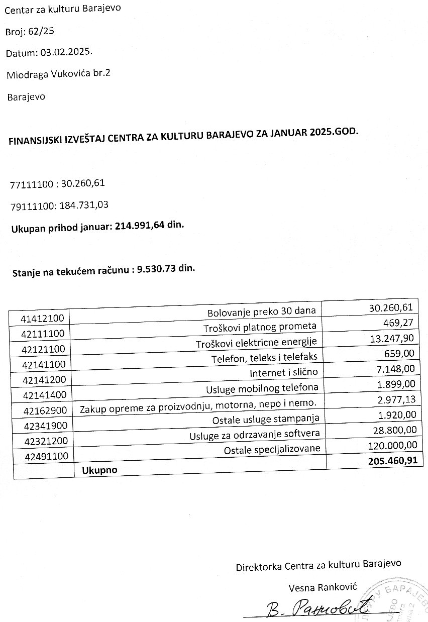 Финансијски извештај Центра за културу Барајево за децембар 2020. године